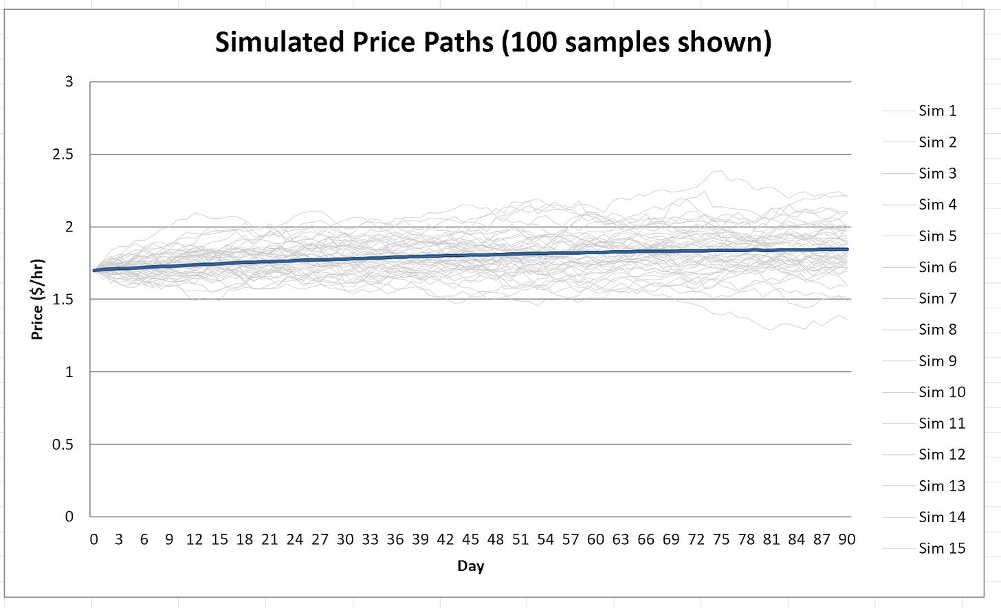 Numbers only tell part of the story. Looking at the simulated price paths makes the uncertainty tangible.
