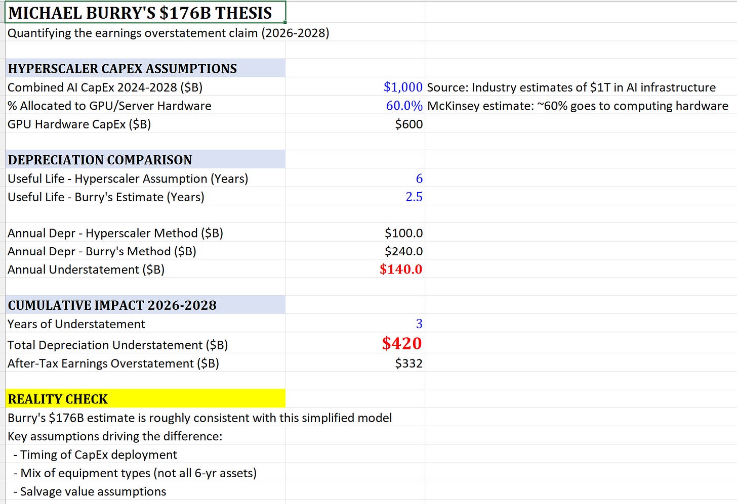 Now scale this to the hyperscalers’ combined AI CapEx of $600+ billion in GPU hardware over the next few years. If the true useful life is three years rather than six, the industry is understating depreciation by $50-60 billion annually. Over Burry’s 2026-2028 window, that compounds to something in the neighborhood of his $176 billion estimate.