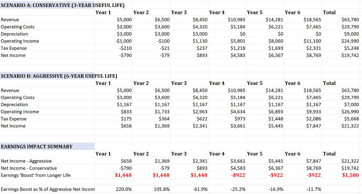 If you depreciate that $40,000 GPU over three years, you recognize roughly ($40,000 / 3 years) ≈ $13,333 in expense annually. Depreciate it over six years, and the annual expense drops to roughly $6,667. Same cash outlay, same equipment, but reported profits are dramatically different.
