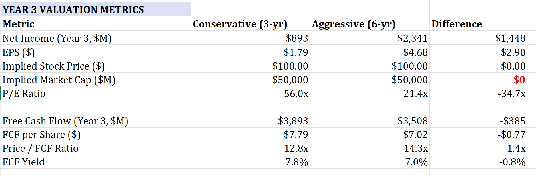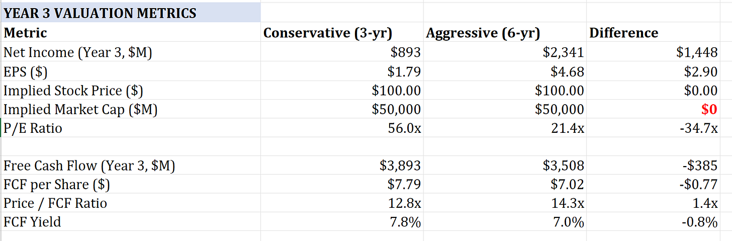 The difference between these frameworks is enormous. Consider two versions of the same company in year three of a GPU investment cycle. Under conservative depreciation, EPS is $1.79 and the P/E ratio is 56x. Under aggressive depreciation, EPS is $4.68 and the P/E is 21x. Same business, same cash generation, but one looks expensive and one looks reasonably valued.