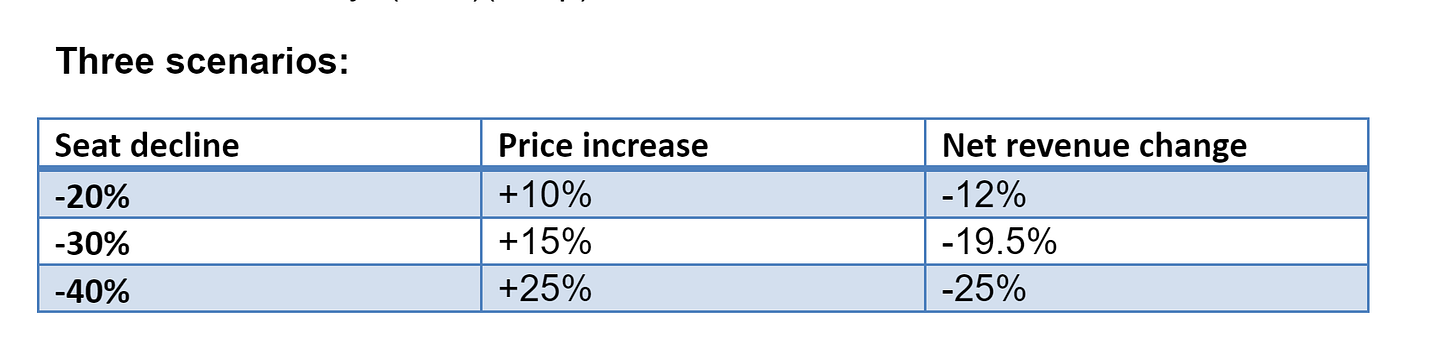 Consider what happens when AI tools make workers meaningfully more productive. A simple sensitivity analysis shows the problem. Let seats drop by s% and price per seat rise by p%. Revenue scales by (1 - s)*(1 + p)